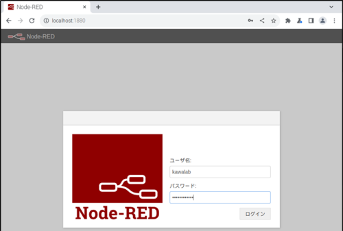 ⑦ ブラウザを起動して、http://localhost:1880/ にアクセスします。ユーザー名とパスワードを聞いてきますので、先ほど設定した値を入力します。