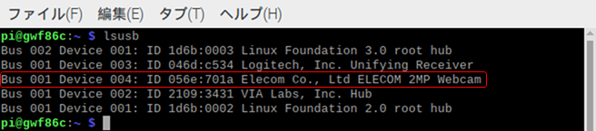 USBカメラを、Raspberry Pi4のUSBに挿し、以下のコマンドを端末で入力し、認識されているかを確認します。
