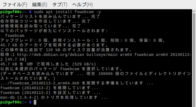 以下のコマンドで、fswebcamをインストールします。