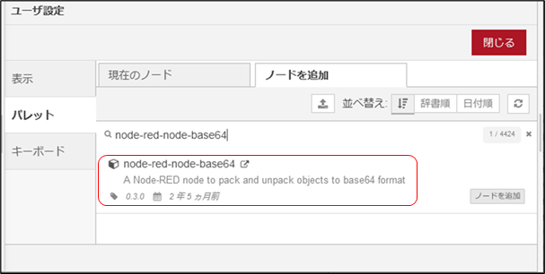 Node-REDを起動します。フローエディタのパレット管理を開いて、