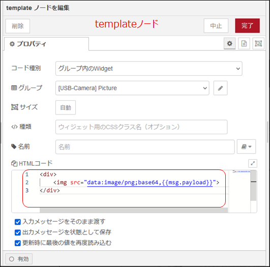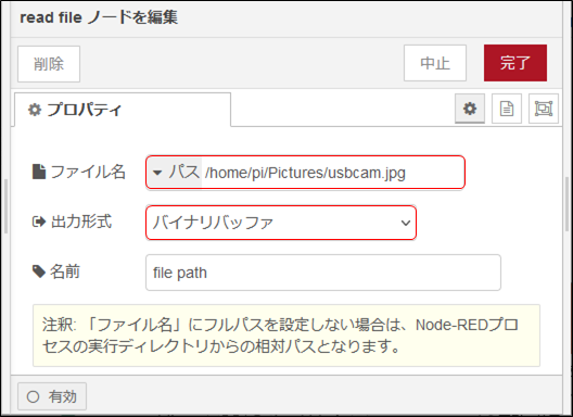 execノードで指定したファイル名 “/home/pi/Pictures/usbcam.jpg”を読み込んで、バイナリデータとして出力します。
