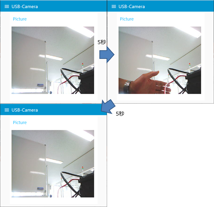 5秒おきに、撮影を行っています。以下の様に、手をかざすと手が写り込むことが確認できた。