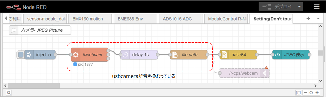 Node-REDのフローは、以下の様になっています(タブ“Setting(Don’t touch)”を参照)。本編の説明でのフローのusbcameの部分が、execノードとdelayノードとread fileノードに置き換わっています。