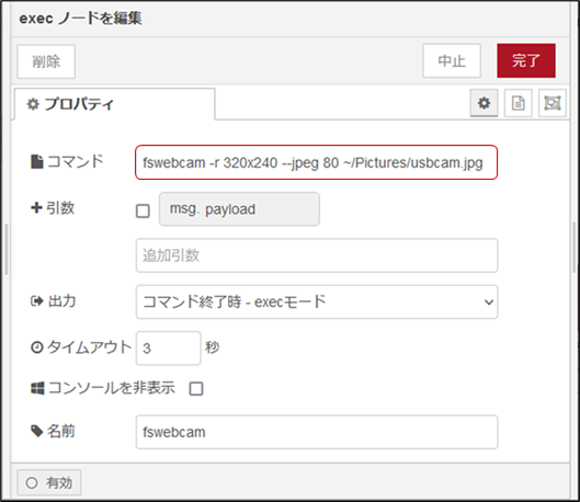 execノードの中身は、“fswebcam -r 320×240 –jpeg 80 ~/Pictures/usbcam.jpg”となっており、fswebcamを直接起動しています。