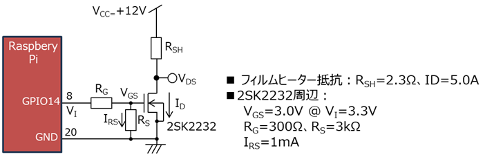 フィルムヒーター(AL-DC-A6-30-2.3A)のON/OFF制御回路は、Nch パワーMOS Trを使って行う。図2に制御回路の回路図を載せます。ここではNchパワーMOS Trとして2SK2232を使用しています。