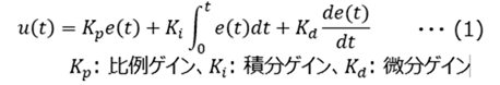 数式で表すと、操作量 u(t) は以下のようになります(e(t) は偏差)