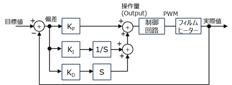 フィルムヒータは、制御回路の制御により、電圧が供給されると発熱し電圧が切れると発熱を止めます。そこで、サーミスタの温度をモニタしたRaspberry Piが制御回路の電源ON/OFFを制御し水温を目標温度に保ちます。その制御の手法として、PID(Proportional-integral-Derivative)制御を使用します。