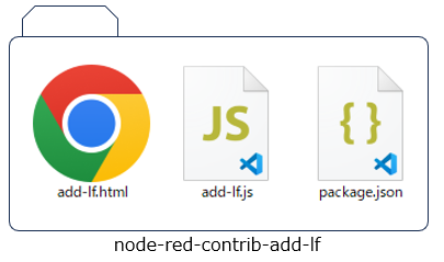 カスタムノードを作成するためのフォルダ、例えばhome直下に空のフォルダを作成し、[node-red-contrib-add-lf]という名称にして、フォルダ内にadd-lf.js とadd-lf.htmlの2つのファイルを作成します。w