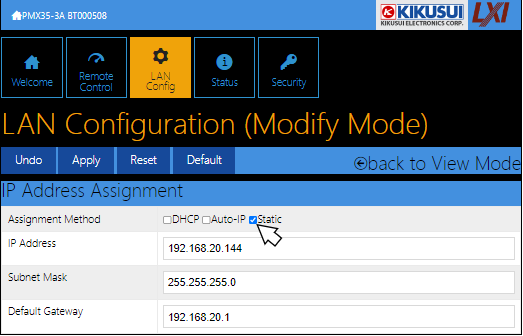 LAN Config/IP Address Assignmentの画面を開き、Assignment/Method の項目でStaticのチェックボックスをONにして[Apply]ボタンを押して設定を書き込みます。