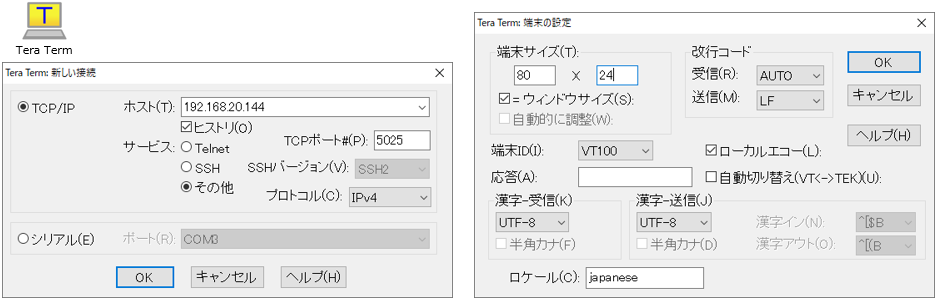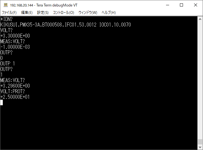 次に、どのような接続をしてSCPIコマンドによる制御が可能か確認します。取扱説明書によるとSCPI-RAW プロトコル(ポート: 5025)でコマンドを送信し、続けてプログラムターミネータとしてLF(0x0A)を送信します。SCPIコマンドは階層構造を持つコマンドですが、コマンドストリングを送信すると、階層はルートレベルに戻ります。この条件に沿って、Tera Termを使用して接続テストを行いました。