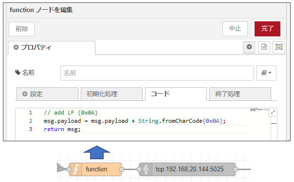 この構成で上手く動作する事が確認できたので、今回はこの仕組みでカスタムノード作成のサンプルとして、「送信する文字列の後ろにLF(0x0A)を付加する」という動作のノードを作ってみます。