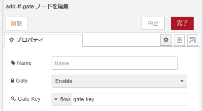 リモートで電源装置に限らず計測器などをコントロールする場合、ロボットでも同様ですが制御コマンドの流れをコントロールする仕組みとしてゲート機能があれば安全に便利に使えます。そこで、先に作成したadd-lfノードにgateを追加したadd-lf-gateノードを新たに作成します。