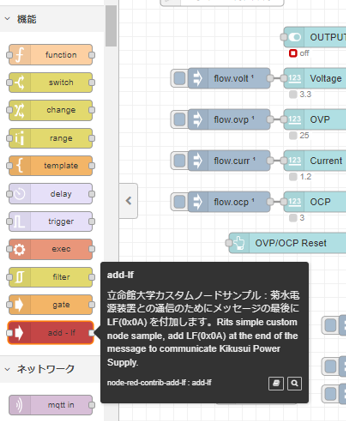 <p>立命館大学カスタムノードサンプル:菊水電源装置との通信のためにメッセージの最後に LF(0x0A) を付加します。Rits simple custom node sample, add LF(0x0A) at the end of the message to communicate Kikusui Power Supply.</p>