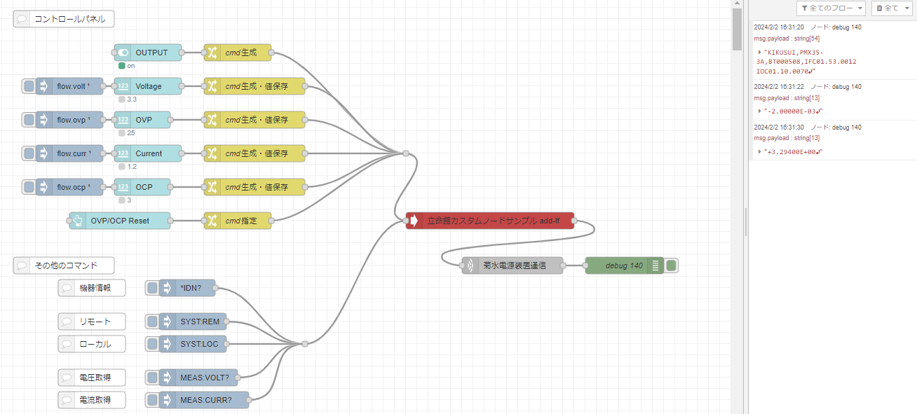SCPIコマンドは、試験・計測装置向けに考案されたASCIIベースのコマンドです。制御コマンドリストは菊水電子のサイトから入手できます。今回のカスタムノード作成は、後者のSCPIコマンドを使ってNode-REDから装置をコントロールするように進めます。
