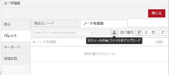 このファイルをNode-RED フローエディタの「パレットの管理」から「ノードを追加」タブを開き、「モジュールのtgzファイルをアップロード」ボタンを押してアップロードします。