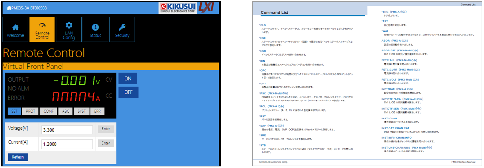 題材として、LANを経由して各種のコントロールが可能な直流安定化電源装置、菊水電子製PMX-Aを使用します。まずこの機材の仕様を確認します。