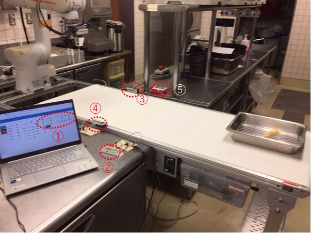・①はNode-REDのダッシュボードの画面です。盛付システムの進行をLEDの色で表示します。また、Amazon echoと連携しており、「アレクサ、天ぷら揚げて」と言うと盛付システムが起動し、LEDの色が変わります。そして、天ぷらの搬送、盛付ロボによる盛付、空トレイの逆送をLEDで表示します。