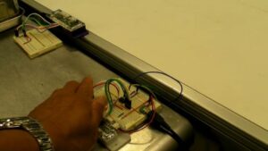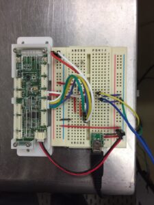 最終的には、盛付ロボットと連動し、盛付ロボットからの終了信号をもらい、ベルトコンベアを逆送させる予定ですが、今回は、preMSMに搭載しているカラーセンサS11059の明るさ信号であるIR信号を利用し、センサに手をかざし光を遮ることでベルトコンベアを逆送させました。非接触ボタンとして、ベルトコンベアを動作させることができました。
