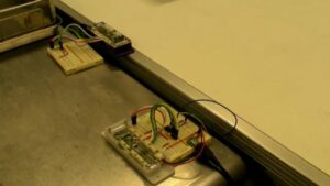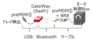 ・preMSM③の近接センサでトレイを検出します。そのため、RPR0521の近接センサの出力をUSBでゲートウェイに送信します。今回は配置がすぐ隣でしたので、USBでの転送にしました。また、preMSMのRPR0521のサンプリングをデフォルトの1.2秒から0.1秒に変更し、トレイ検出スピードを上げています。最速では10ms程度まで上げられそうです。