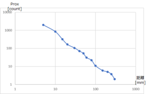結果は、両軸を対数表時にした場合に距離が離れると小さくなる関係が直線で確認できました。近接センサの仕様によると物体無の場合のカウント値の最大値が10とあり、今回の実験では300mmのときに2の値になっています。