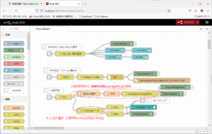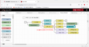 図11にトレイ検出部分のNode-REDを示します。コメントが書かれている部分が、10回平均を行っているところとセンサの値が15超えたかどうかを判定する部分です。