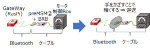 ・モータの制御を行うpreMSM②のカラーセンサを使用し、preMSM②のIR信号の数値をゲートウェイに常時Bluetoothで送り、ゲートウェイ側で値の変化を見て、暗くなったら、逆送のボタンが押された(手がかざされた)と判定し、preMSMにベルトコンベア動作ON、向き:逆転のコマンドを発行します。