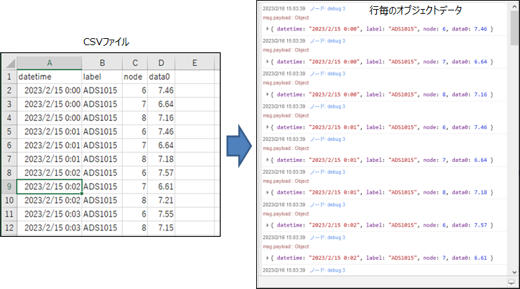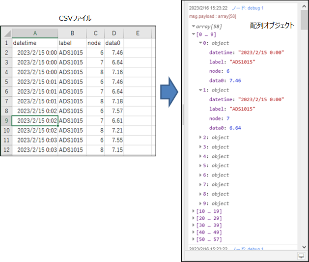 ここでは、functionノードを使って、読み込んだcsvファイルを、次の図のような1つの配列オブジェクトに変換する方法を説明します。