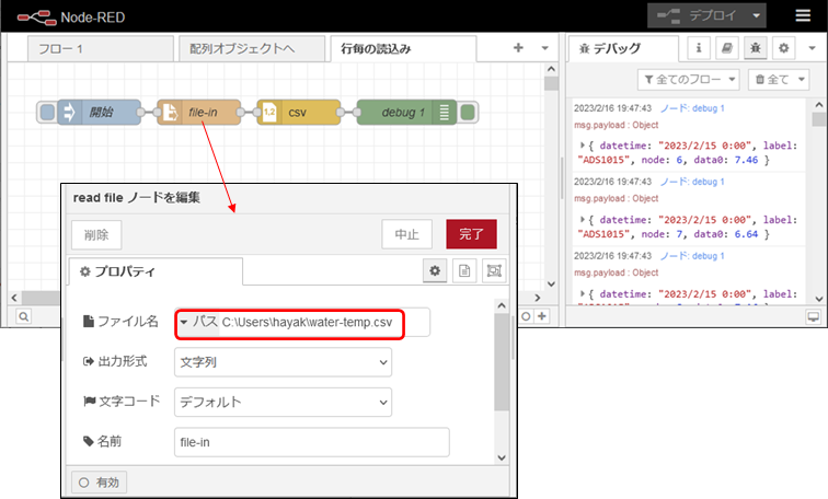 まず、通常のcsvファイルの読込みのNode-REDのフローを示します。injectノードとfile inノードとcsvノードとdebugノードをシリアルに配置した構成です。変更するのは、file inのファイル名の個所だけです。