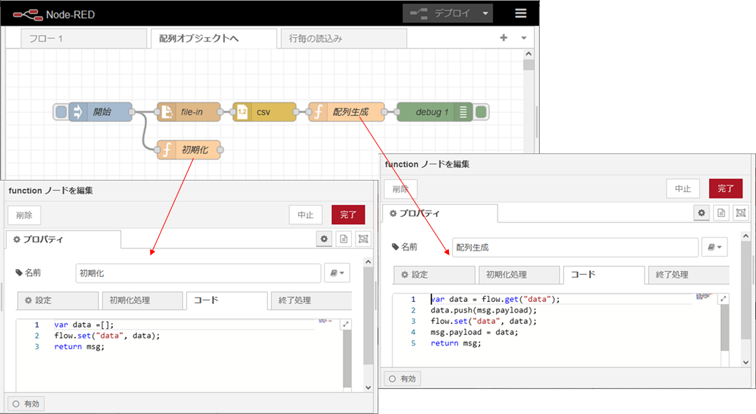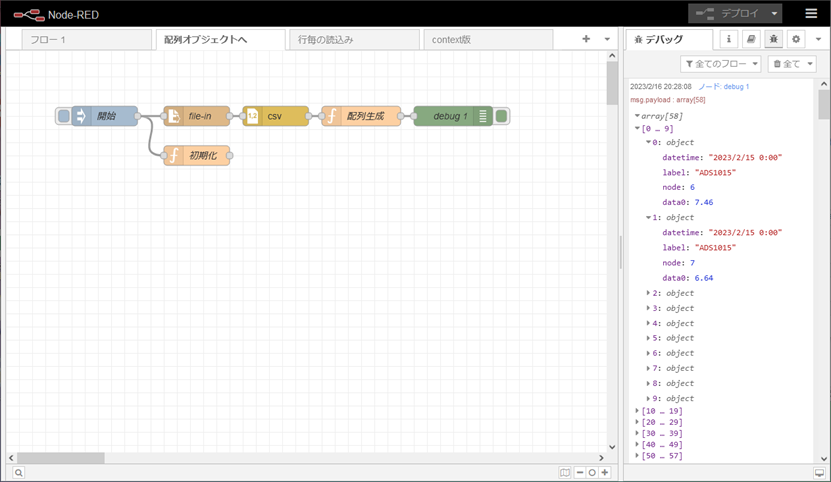 右側の「配列生成」のfunctionノードでは、flow変数dataを取ってきます。そして、ローカル変数dataに代入します。その後、msg.payloadで送られてきた行毎のオブジェクトデータをローカル変数dataに追加(push)します。最後に、ローカル変数dataをflow変数dataに代入します。デバッグ表示のために、ローカル変数dataをmsg.payloadに代入しています。