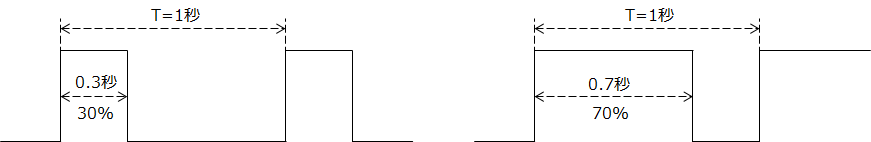 PWM(Pulse Width Modulation)制御とは、パルス幅変調という意味です。電気信号を周期一定のオンとオフの繰り返しにして、そのオンの時間の割合を変えることで、電力や電圧を制御する方法です。例えば、オンとオフの周期が1秒だとしたら、オンの時間が0.5秒なら50%、0.2秒なら20%、0.8秒なら80%というように、パルスの幅を変えることで出力を変えることができます。