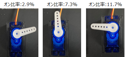 PWMのオン時間を変えた際のサーボモータ(SG90)の動作を次に示します。