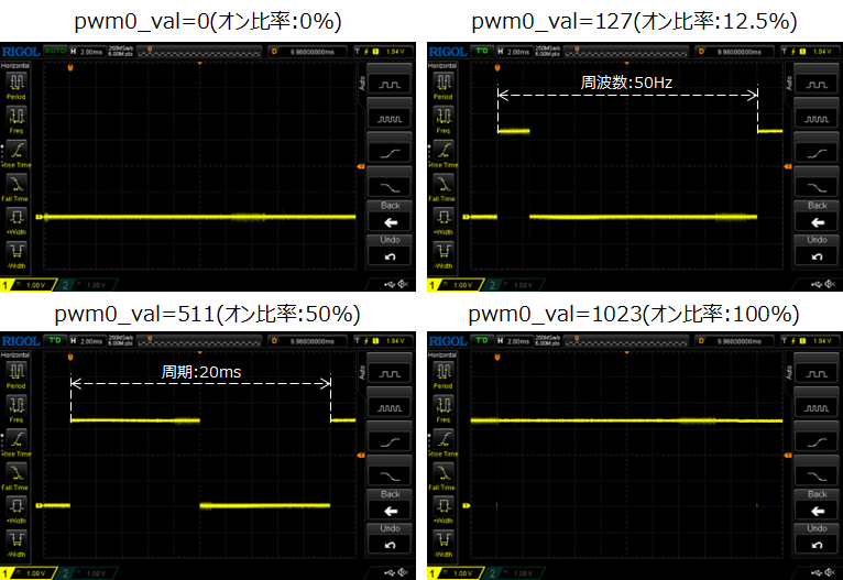 設定値0の場合は、ずっとオフ(オン比率0%)になります。設定値1023の場合は、ずっとオン(オン比率100%)になります。設定値127の時は、オン比率(127+1)/1024 = 12.5%、設定値511の時は、オン比率(511+1)/1024 = 50%になります。次に、波形を示します。