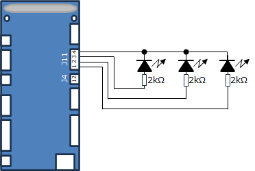 コネクタJ11の4ピンがGNDですので、1ピン、2ピン、3ピンから2kΩの抵抗とLEDを介して4ピンに繋げます。
