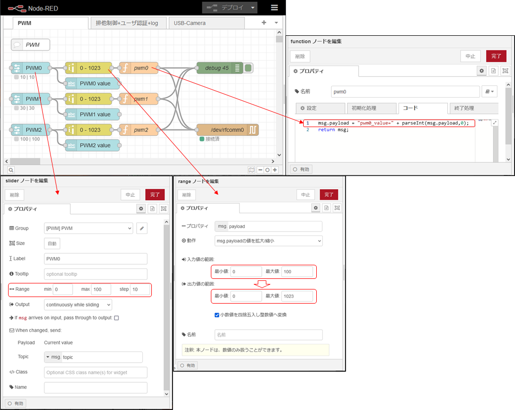 PDHのNode-REDのフローを次に示します。各ピン毎にsliderノードとtextノード、rangeノードとfunctionノードで構成されています。sliderノードは、オン比率0%~100%の間で10%単位で変えることができるように設定しています。そして、textノードで数値の表示を行います。並行して、rangeノードで、0%~100%の数値をpwmの設定値0~1023に変換します。最後のfunctionノードで、pwmのコマンドの形式に変換します。