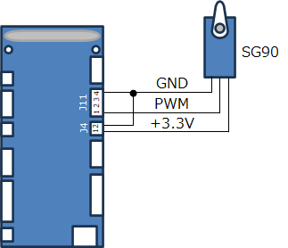 コネクタJ4の1ピンが+3.3Vです。2ピンがGNDですので、J11の4ピンGNDと繋げます。PWMは、J11の1ピンを繋げます。
