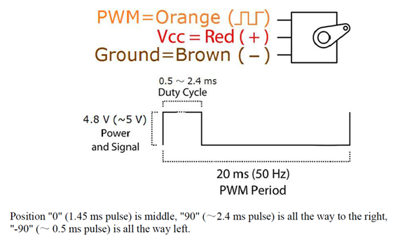 R-MSMのPWMポートには、SG90用のコマンドが準備されています。SG90の仕様を以下に示します。周期20msに対して、1.45msのオン期間があると、中間位置になり、0.5ms以下で-90°、2.4ms以上で90°となる仕様です。