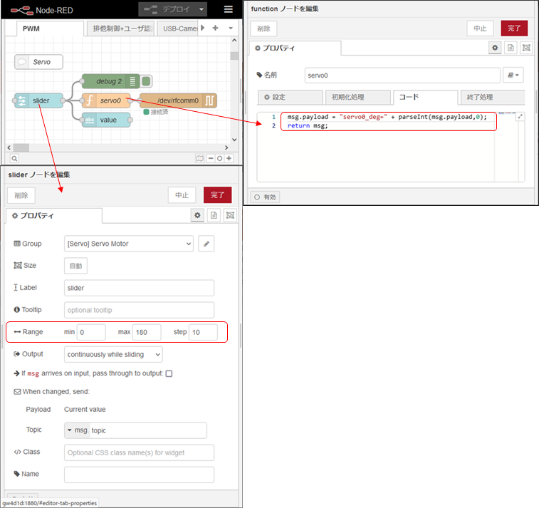 PDHのNode-REDのフローを次に示します。servo0を、sliderノードとtextノード、functionノードで構成しています。sliderノードで0度~180度まで10度ステップで変えることができるようにしています。そのsliderノードの出力をtextノードで表示しています。functionノードは、servo0_degコマンドの形式に変換しています。