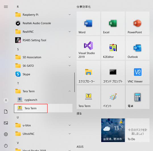 ラズパイアイコンから、左の図のようにして、GTKtermを選択し、起動します。