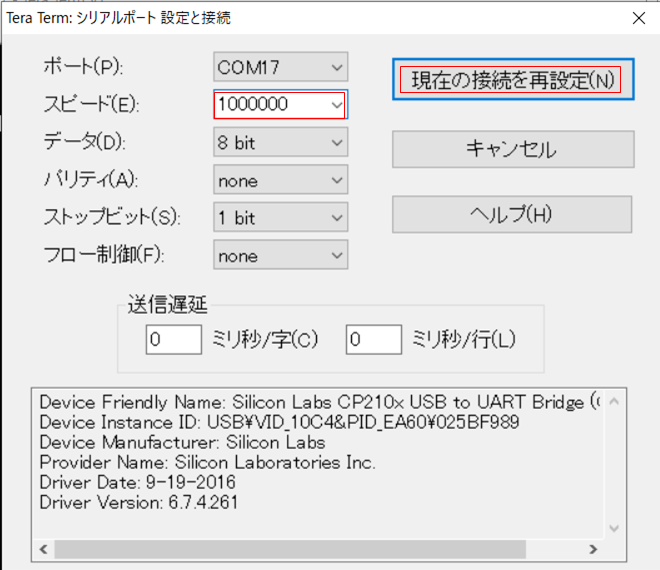 ポートを、/dev/rfcomm0や/dev/rfcomm1のようにハードウェアの設定に従って入力してください。ボーレートは、1000000 bps(1Mbps)と入力してください。それ以外は、デフォルトでOKです。