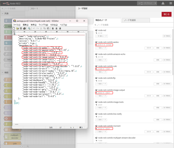 Node-REDの「パレット管理」の画面と、package.jsonの中身を対比した結果を図2に示します。