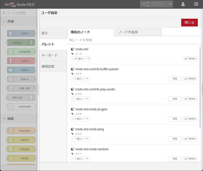 図5-4に、nodeがインストールされているNode-REDの”パレット管理”の画面を示します。
