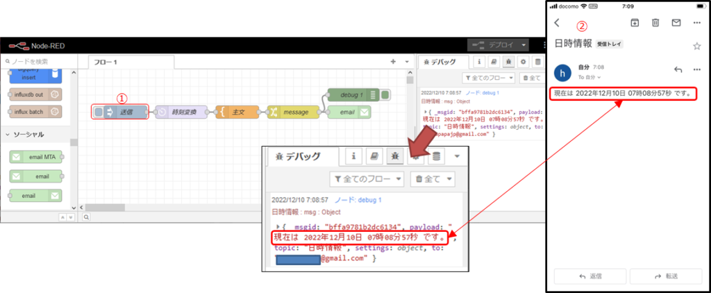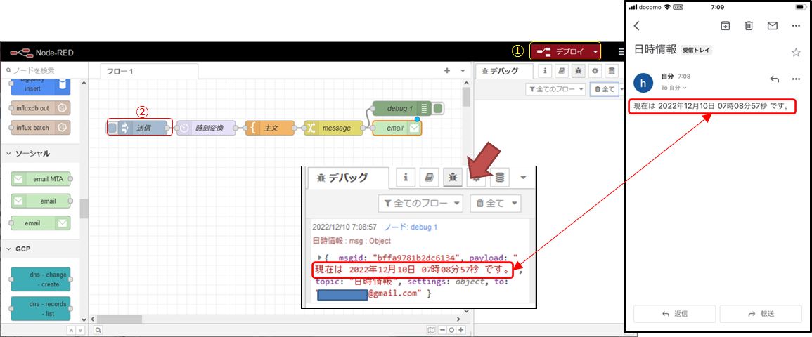 ④ デバッグ画面の日時とgmailに届いたメールの日時が同じか確認してください。