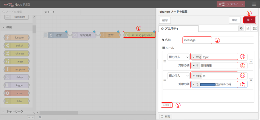 changeノードを配置します。メールの件名は、”msg.topic”に設定します。送信先アドレスは、”msg.to”に設定します。