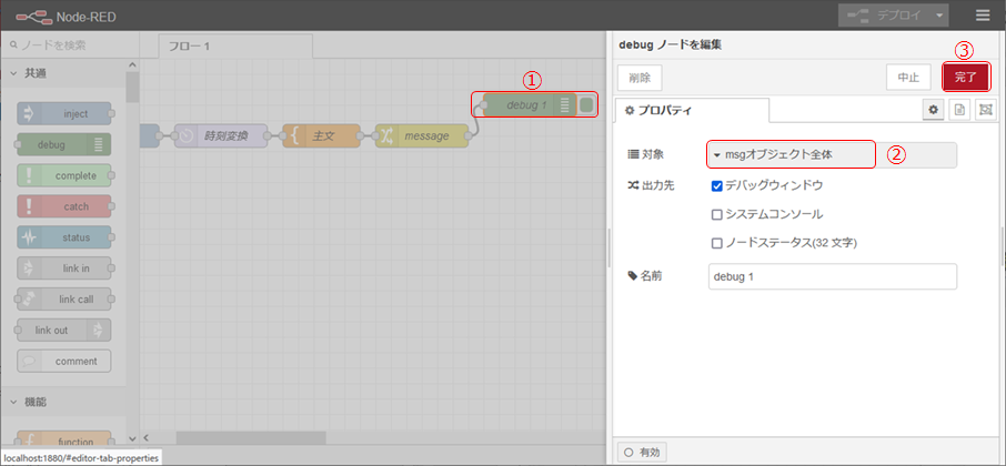 ① debugノードを配置し、changeノードと接続します。そして、ダブルクリックして、プロパティ画面を開きます。