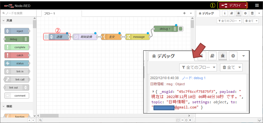 debugノードを使って、メールの送信内容を確認の準備をします。