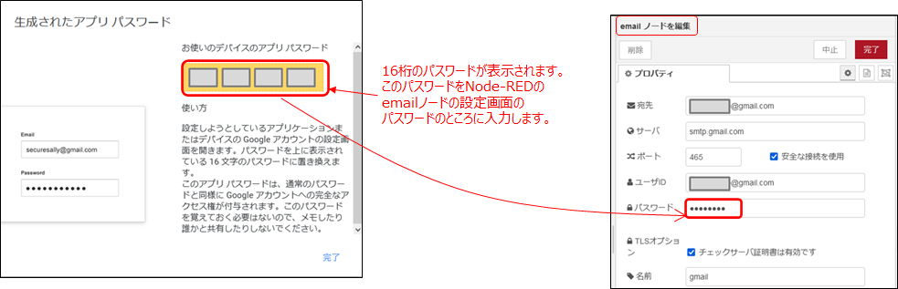 ・Node-REDからgmail経由でemailを発信する際に、gmailのアカウントとパスワードの他に、アプリパスワードが必要になります。