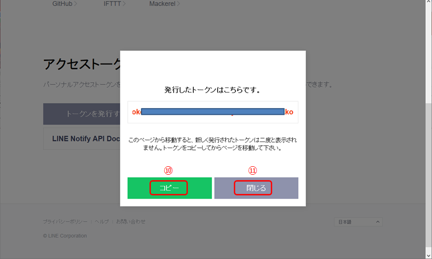 ⑩ アクセストークンが表示されますので、「コピー」ボタンを押し、コピーし、どこかにペーストしておきます。