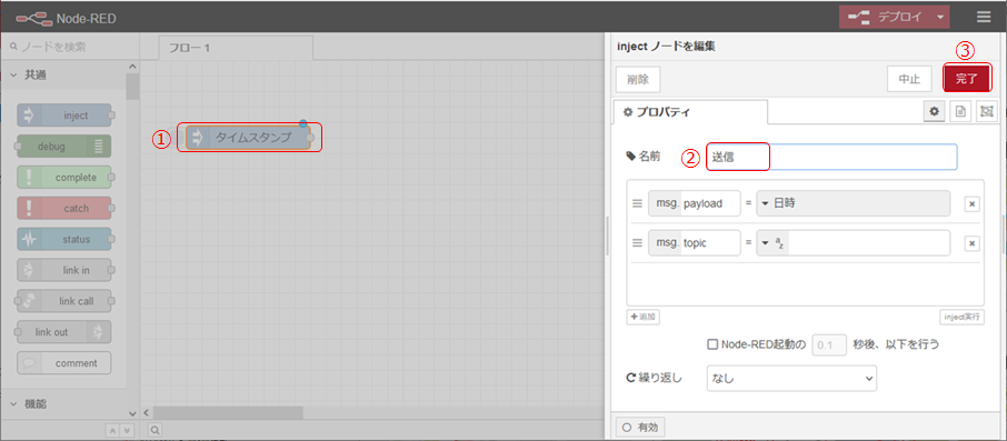 ① injectノードを配置し、ダブルクリックしてプロパティ画面を表示します。