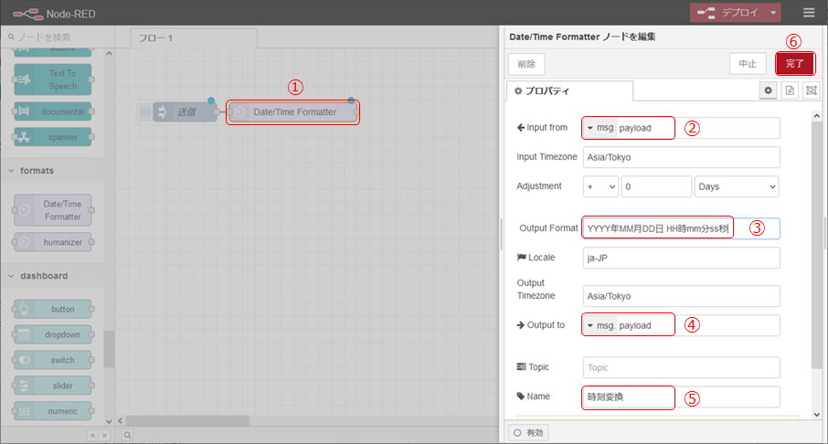 ① Date/Time Formatterノードを配置し、injectノードと接続します。そして、ダブルクリックしてプロパティ画面を表示します。