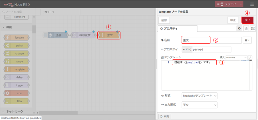 Templateノードの配置します。Templateノードを使用することで、“msg.payload”や”flow“などの変数を簡単に埋め込めます。